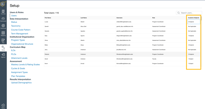 Once you have assigned a user to a Role, you will need to assign the Academic Subjects to both the Faculty and Program Coordinator roles.