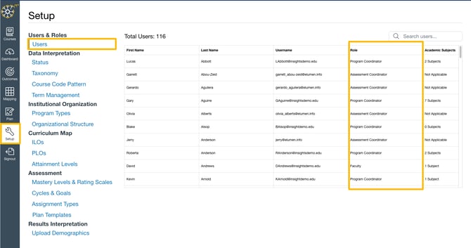 - In the user table (above), Assessment Coordinators will go to the Role column.