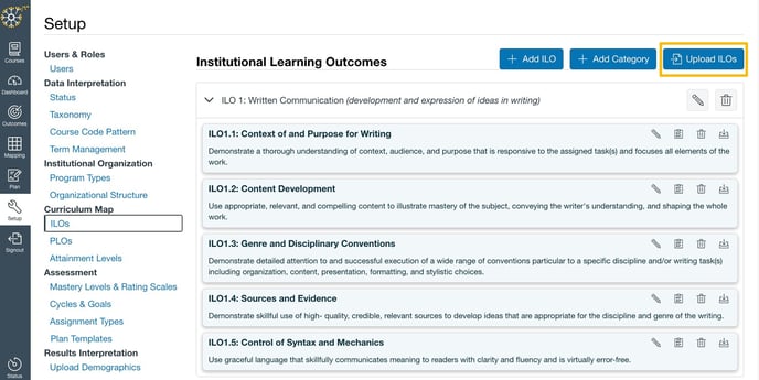 From the Setup menu, go to Curriculum Map and select ILOs. Click the button Upload ILOs.